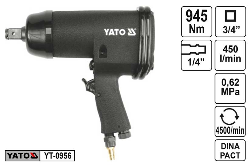 Pneumatický rázový utahovák YATO YT0956 945Nm, 3/4", 0,62MPa Technické parametry viz. foto výrobku .