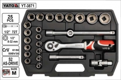 "Profesionální gola sada v provedení CrV a S2 ocel . Sada obsahuje : Ořechy - 1/2”: 8,9,10,11, 12, 13, 14, 15,16,17,18,19,20,21,22,23,24 mm ( L=38mm) , Kloub 1/2" Prodloužení 1/2” (127,254 mm), CrV 50BV30, Ráčna 1/2”, 72T, CrV 6150. 25 dílná sada nástrčných klíčú a ráčny YATO YT3871"
