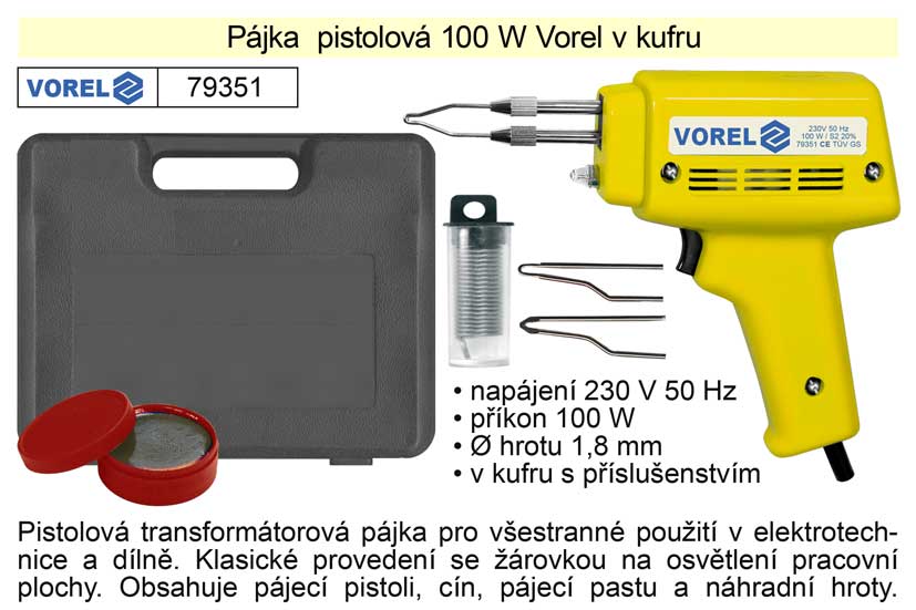 Pistolová transformátorová pájka Vorel 100 W v kufru pro všestranné použití v elektrotechnice a dílně. Klasické provedení se žárovkou na osvětlení pracovní plochy. Obsahuje pájecí pistoli, cín, pájecí pastu a náhradní hroty..