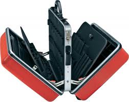"98 99 14LE Univerzální kufr Prázdný Odolné provedení z červeného materiálu ABS. Obvodový hliníkový rám s kroužky tvaru D k upevnění nosného řemenu a pevně namontovanou, stabilní, oboustranně osaditelnou středovou stěnou, s mnohostrannými možnostmi zasunutí nářadí díky elastickým páskům a 12ti malým kapsami. Zatížitelnost do 30kg. Kódovaný zámek otevíraný kombinací 3 čísel a 2 sklopné zámky k uzamykání víka. Vyjímatelná příhrádka na doklady a vyjímatelná tabulka na nářadí, osaditelná jednostranně, se 13 kapsami na nářadí. 2 sklopné zámky k fixování dna Dno ve tvaru vaničky, výška 58, rozdělitelné pružnými vložkami a s krycí deskou se 6 velkými kapsami na nářadí, fixovatelnou pomocí patentky Rozměry, vnější ( x V x H): 490 x 255 x 410 mm. Rozměry, vnitřní ( x V x H): 445 x (105 + 105) x 350 mm "